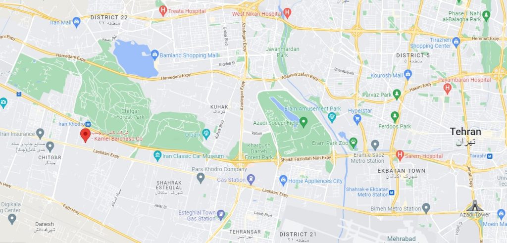 آدرس: تهران، منطقه 21، محله شهرک دانشگاه، بزرگراه لشگری (جاده مخصوص کرج)، کیلومتر 13، جنب کاشی ایرانا، خیابان امید، نبش کوچه چهارم شرقی