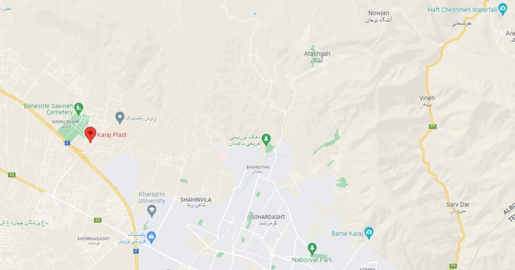 آدرس: کرج، 5 کیلومتر بعد از پل حصارک، شهرک صنعتی بهارستان، انتهای خیابان بوستان جنوبی، نبش خیابان تصفیهخانه (قطعه 9 از بلوک 21)
