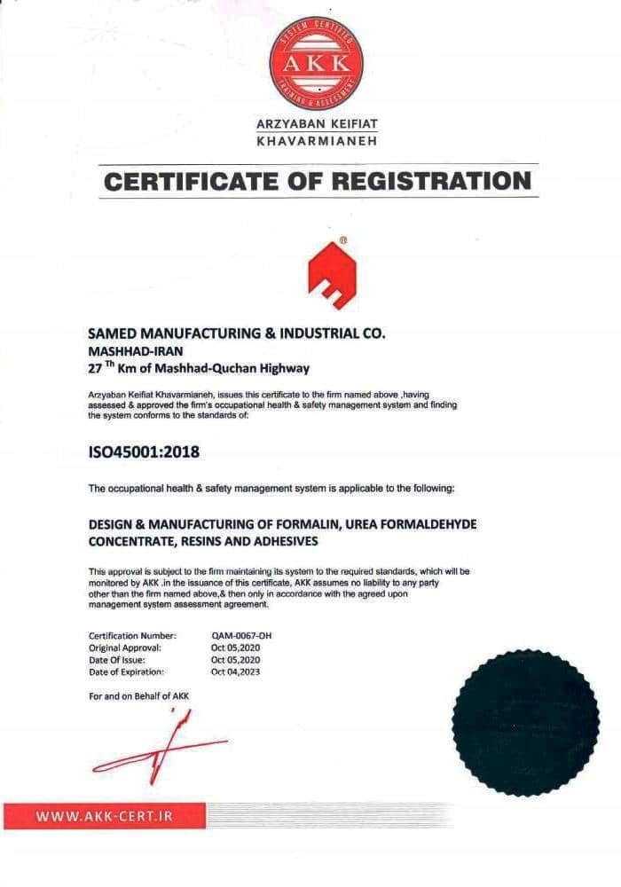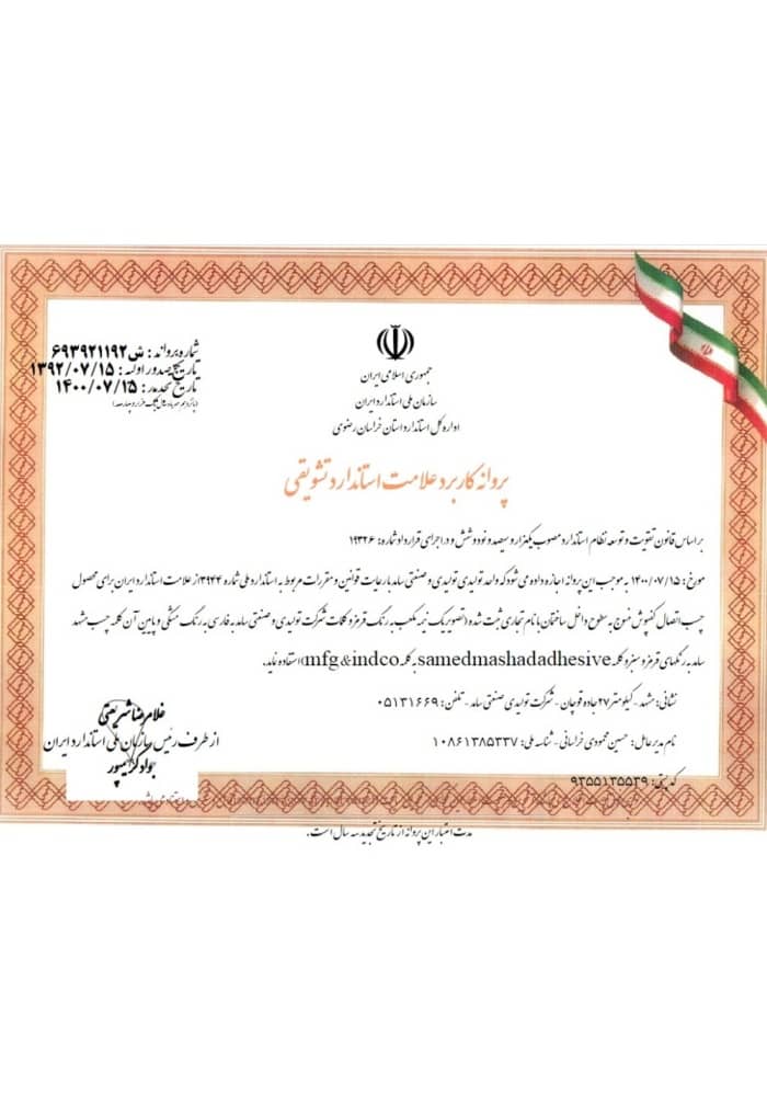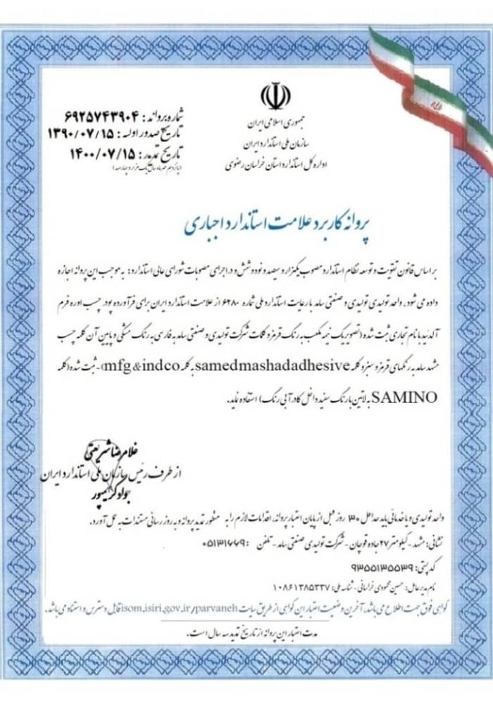 گواهینامه مدیریت سیستم کیفیت ISO9001:2015 – گواهینامه مدیریت سیستم زیست محیطی ISO14001:2015-گواهینامه مدیریت ایمنی و بهداشت حرفه ای ISO45001:2018 – گواهینامه ارزیابی شکایت مشتریانISO10002:2018 – استاندارد اجباری 3264 ملی ایران(چسب چوب)- استاندارد اجباری 6280 ملی ایران (پودر سامینو)- استاندارد تشویقی 3944 ملی ایران(کفپوش)
