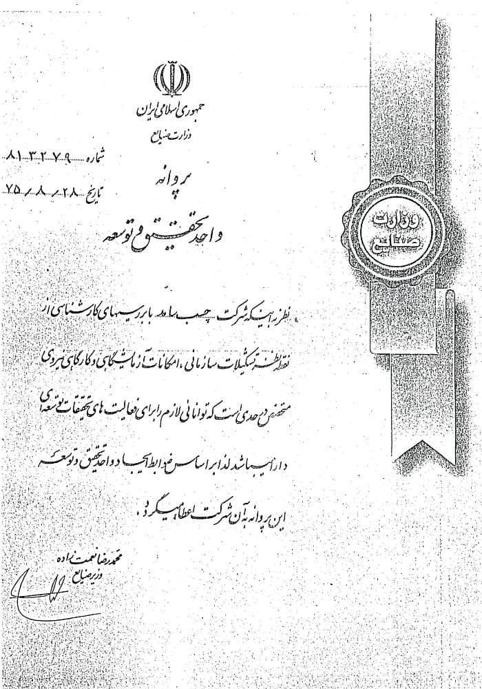 پروانه بهره برداری جهت کلیه محصولات تولیدی از وزارت صنعت ، معدن و تجارت – پروانه تحقیق و توسعه وزارت صنعت ، معدن و تجارت،- جواز تاسیس مرکز پژوهشی