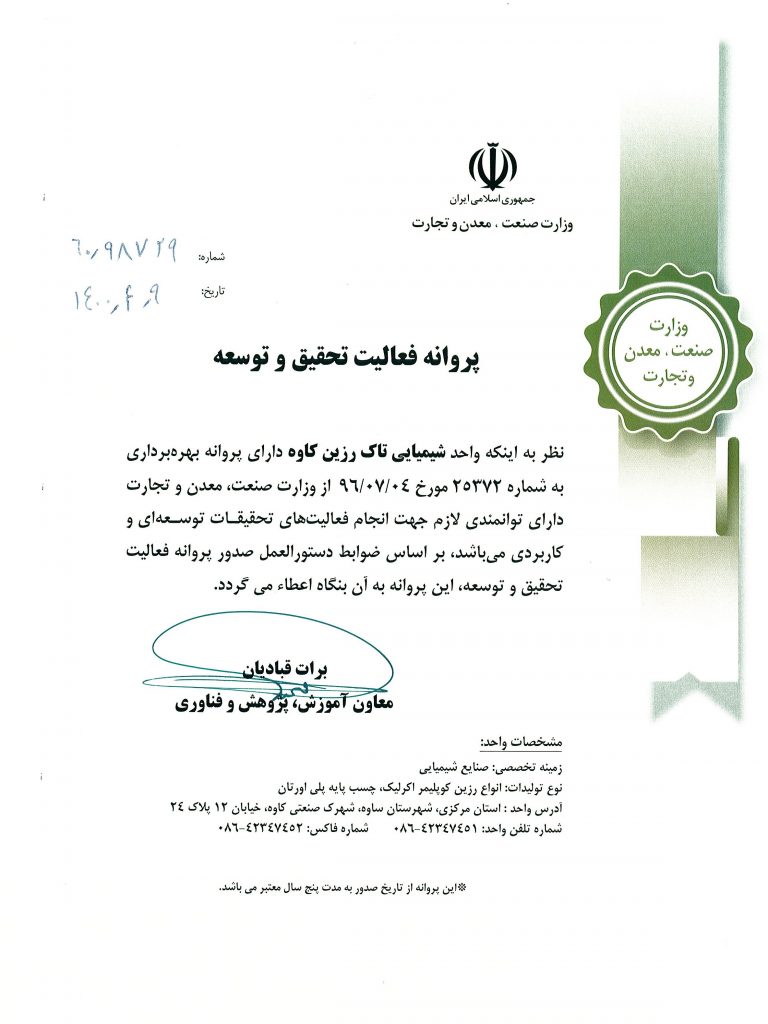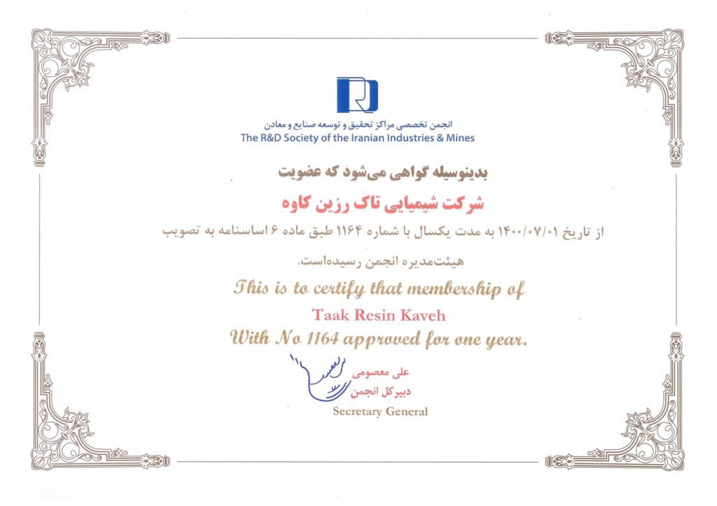 شرکت شیمیایی تاک رزین کاوه از سال ۱۳۹۵ جزو شرکت ها و موسسات دانش بنیان تولیدی قرار گرفت.شرکت دانش بنیان به شرکت دارای سطح بالای فن آوری کالا، خدمات و همچنین تسلط کافی بر دانش فنی جهت تولیدات با کیفیت محصولات گفته می شود. کارگروه ارزیابی و تشخیص صلاحیت شرکت های دانش بنیان تحت نظر معاونت علمی و فناوری نهاد ریاست جمهوری پس از بررسی و مطالعه سطح فن آوری، وضعیت تولید کالا، خدمات و تسلط شرکت بر دانش فنی گواهی شرکت دانش بنیان صنعتی را صادر می نماید. که این شرکت ها به منظور افزایش علم وثروت، توسعه اقتصادی، تحقق اهداف علمی در راستای گسترش نو آوری، و در نهایت تجاری سازی نتایج تحقیق و توسعه ی خود، در حوزه فناوری های برتر ، جهت نیل به اهداف زیر فعالیت می نماید: