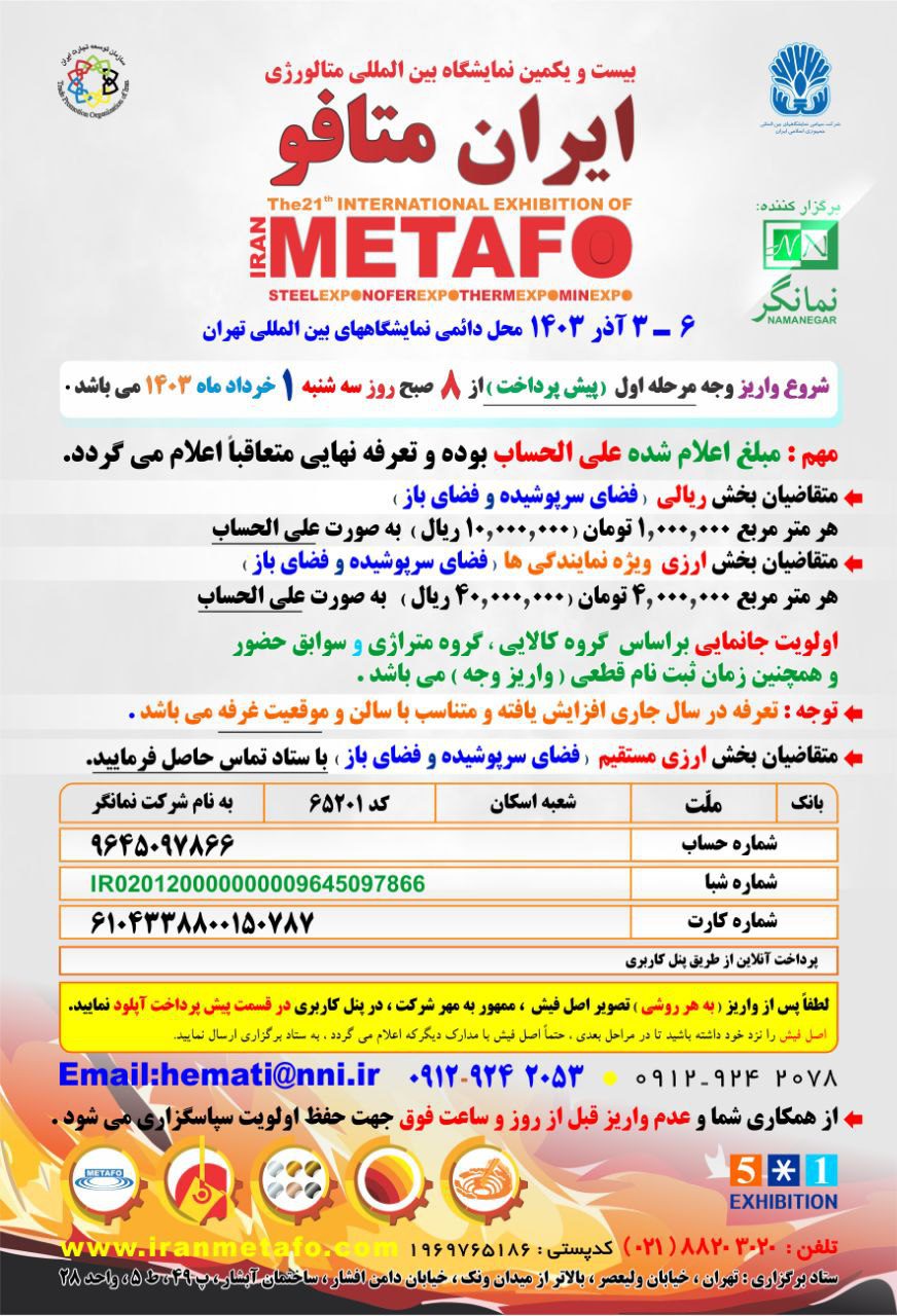 نمایشگاه متالورژی | بیست و یکمین نمایشگاه بین المللی متالورژی، فولاد، صنایع معدنی، آهنگری و ماشین کاری، قالب سازی و ریخته گری تهران ۱۴۰۴