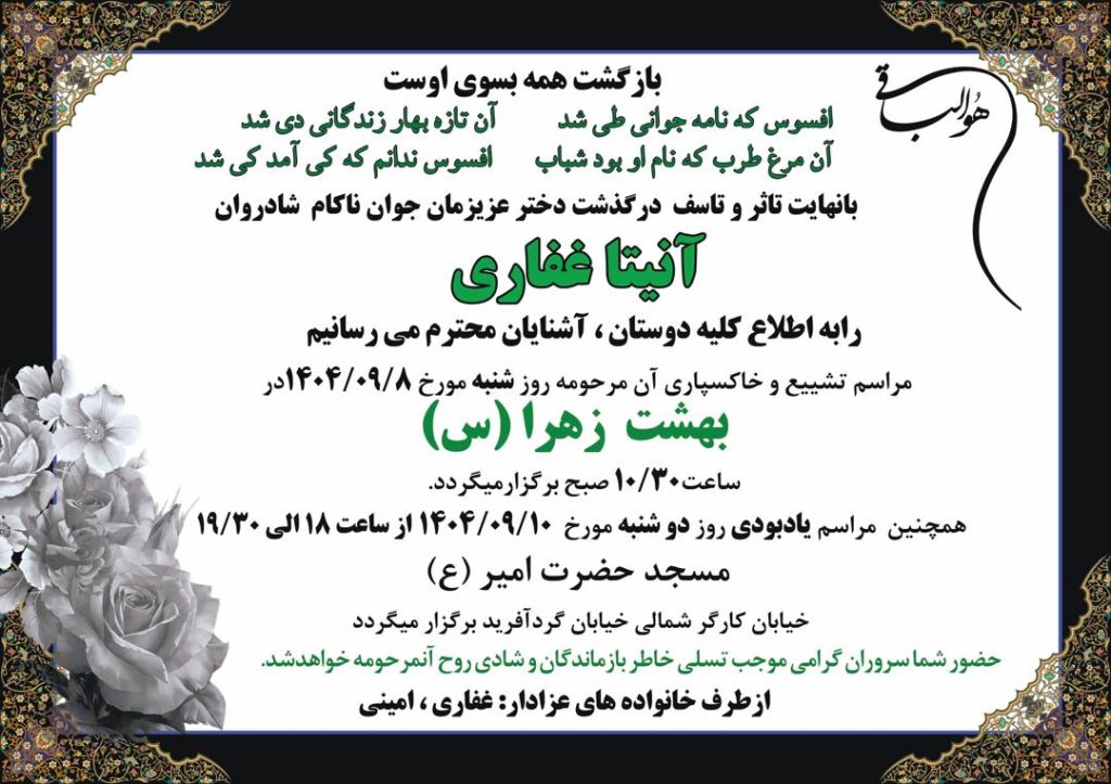 درگذشت خانم آنیتا غفاری، فرزند ارجمند افشین غفاری عضو هیات مدیره انجمن غرفهسازان و مدیرعامل شرکت سرو پارس، موجی از اندوه در خانواده صنعت نمایشگاهی ایران ایجاد کرده است.
