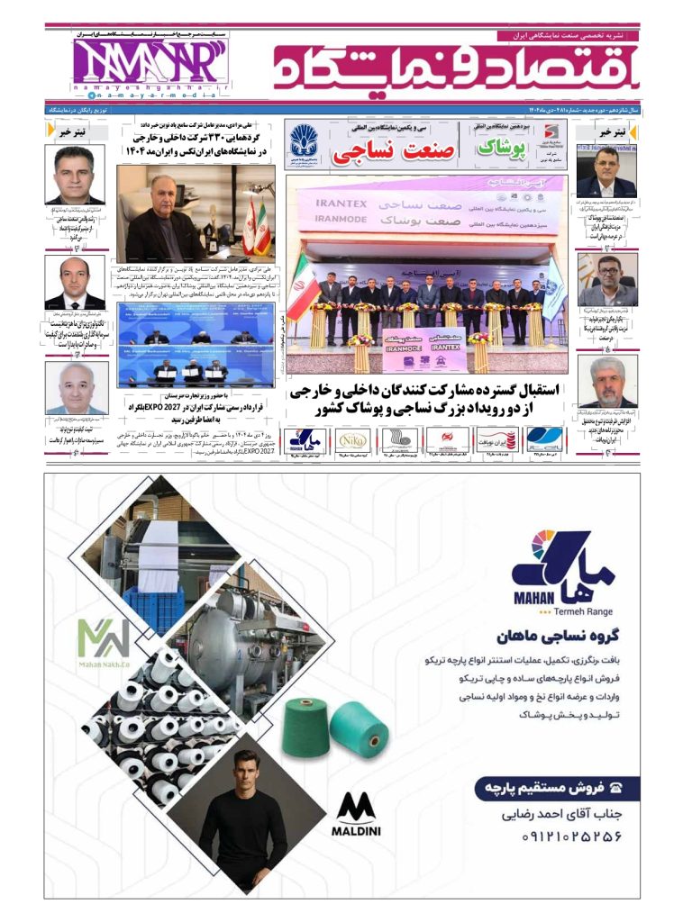 انتشار نشریه اقتصاد و نمایشگاه به مناسبت برگزاری نمایشگاه های بین المللی ایرانتکس و ایرانمد ۱۴۰۴ 1404-10-12 / پوشاک, خبر, نساجی / از ادمین سایت shomarehh481 nasajiدریافت