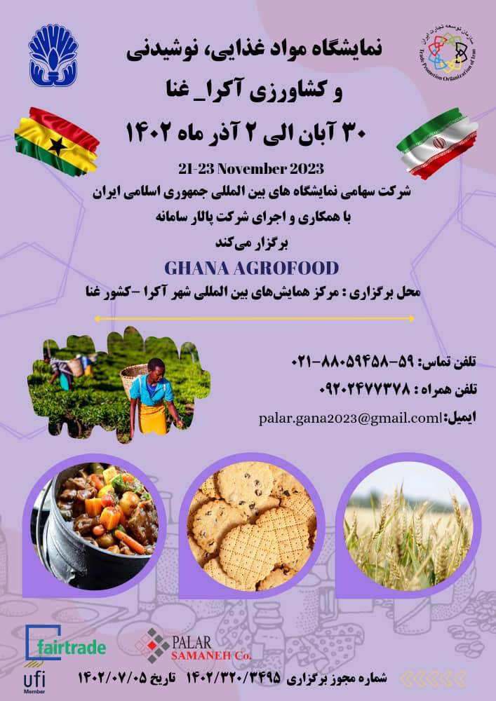 پاویون ایران در نمایشگاه مواد غذایی نوشیدنی و کشاورزی آکرا-غنا با همکاری و اجرای شرکت سهامی نمایشگاه های بین المللی و شرکت پالار سامانه از تاریخ ۳۰ آبان تا ۲ آذرماه ۱۴۰۲ در مرکز همایش های بین المللی شهر آکرا غنا برگزار می شود.