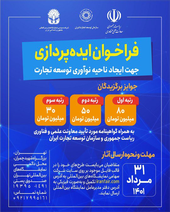 به گزارش اخبار نمایشگاه ها به نقل از پایگاه اطلاع رسانی نمایشگاه بین المللی، هومن رازدار در نشست خبری و امضای تفاهم نامه همکاری با معاونت علمی و فناوری ریاست جمهوری از فعالان اکوسیستم نوآوری و دانش بنیان کشور، صاحبان کسب و کار، فعالان تجاری و صاحبان ایده های نوآورانه دعوت بعمل آورد تا در فراخوان ایده پردازی مشارکت نمایند و با ارائه طرح و ایده خود در جهت توسعه تجارت گامی موثر بردارند.